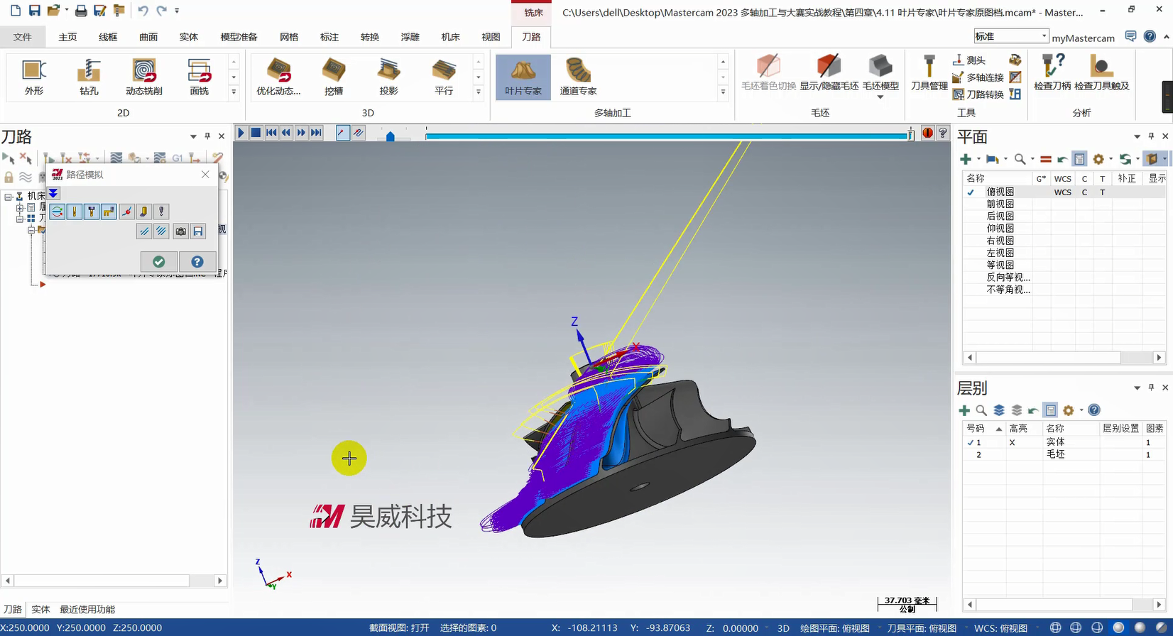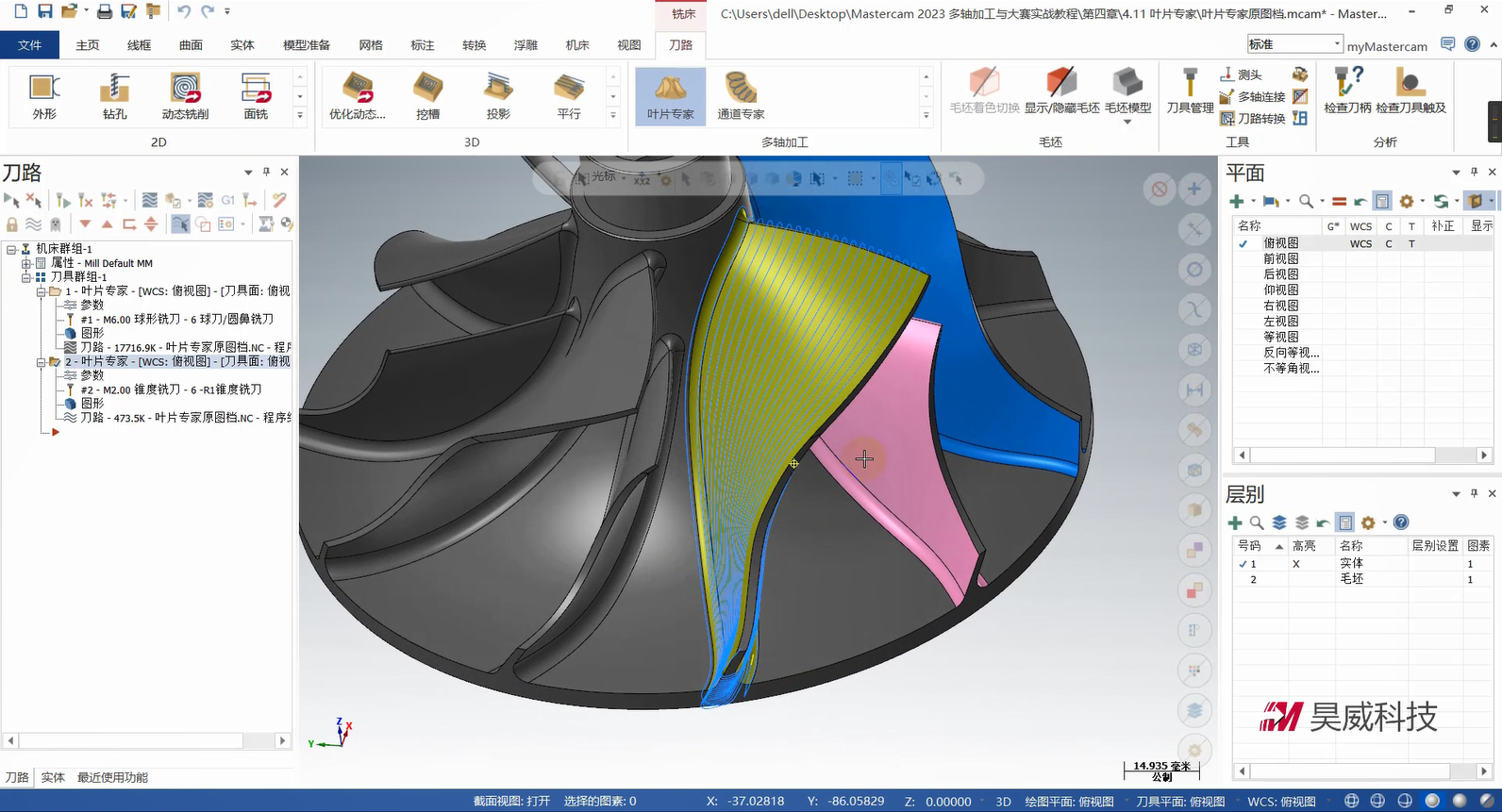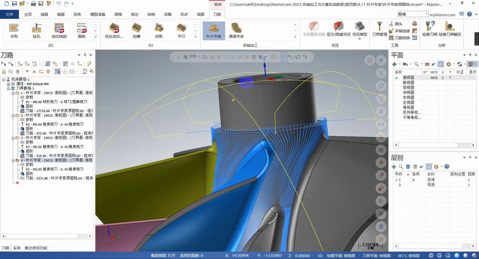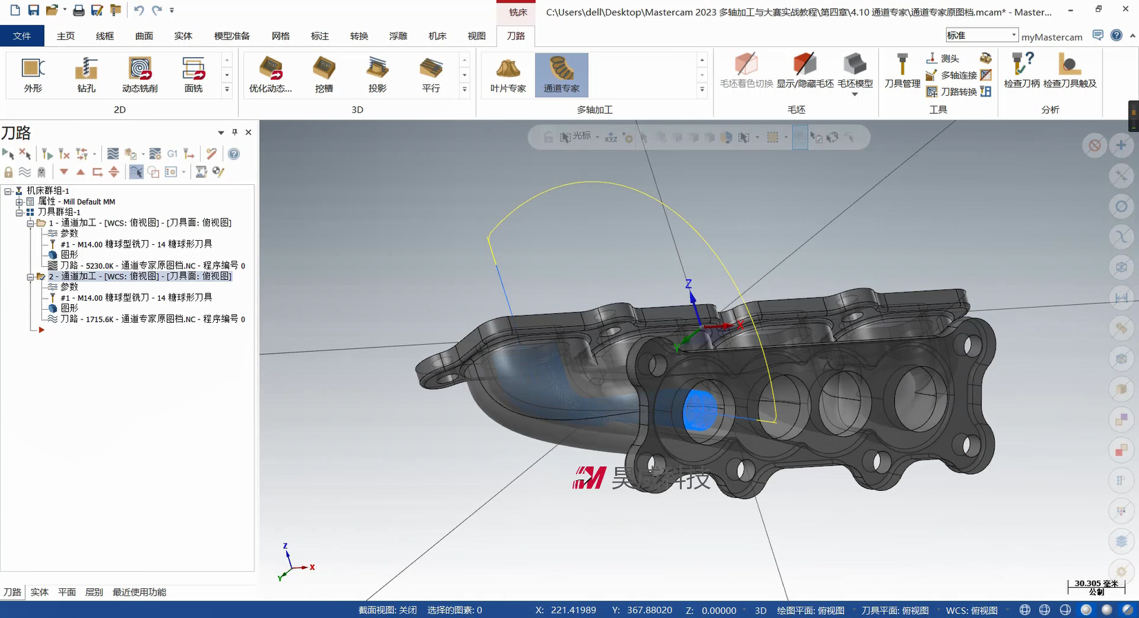 本章构建多轴联动编程的策略体系,从基础到高级功能层层递进。基础部分详解曲线策略、侧刃铣削的参数设定与刀路优化,涵盖切入切出设置、分层加工等拓展应用,提升常规零件加工效率。高级策略部分重点讲解智能综合策略的驱动模式与碰撞控制、沿面策略及多曲面策略的刀轴投影补正,满足曲面刻字、去毛刺等特殊需求。此外,课程针对挖槽加工细分粗切、侧壁与底面精加工策略,结合进给速率控制与刀轴调整提升加工质量;旋转策略部分则覆盖切削方式设定、安全区域设置等核心技术。针对叶轮加工场景,专门解析叶片专家策略中轮毂、圆角及叶片部位的精修技术,并为大家讲解通道专家策略的使用方法,适配航空航天等领域复杂零件加工。