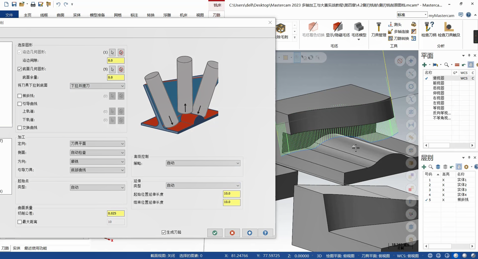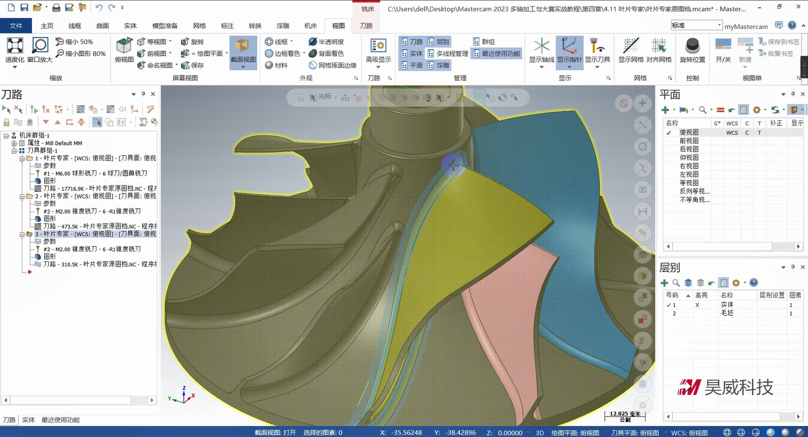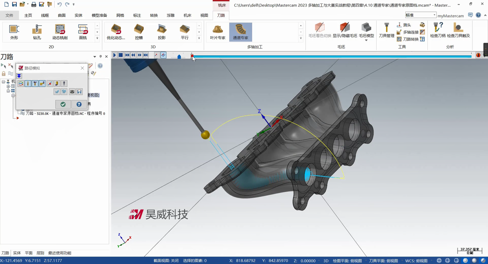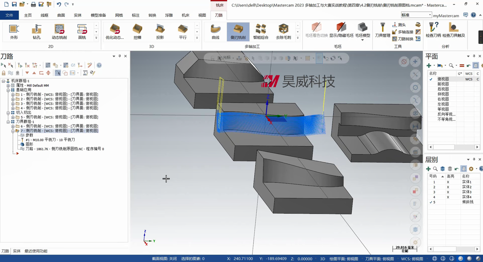 本章构建多轴联动编程的策略体系,从基础到高级功能层层递进。基础部分详解曲线策略、侧刃铣削的参数设定与刀路优化,涵盖切入切出设置、分层加工等拓展应用,提升常规零件加工效率。高级策略部分重点讲解智能综合策略的驱动模式与碰撞控制、沿面策略及多曲面策略的刀轴投影补正,满足曲面刻字、去毛刺等特殊需求。此外,课程针对挖槽加工细分粗切、侧壁与底面精加工策略,结合进给速率控制与刀轴调整提升加工质量;旋转策略部分则覆盖切削方式设定、安全区域设置等核心技术。针对叶轮加工场景,专门解析叶片专家策略中轮毂、圆角及叶片部位的精修技术,并为大家讲解通道专家策略的使用方法,适配航空航天等领域复杂零件加工。