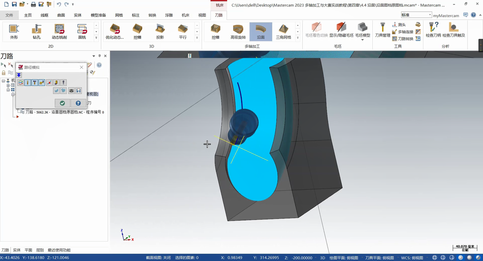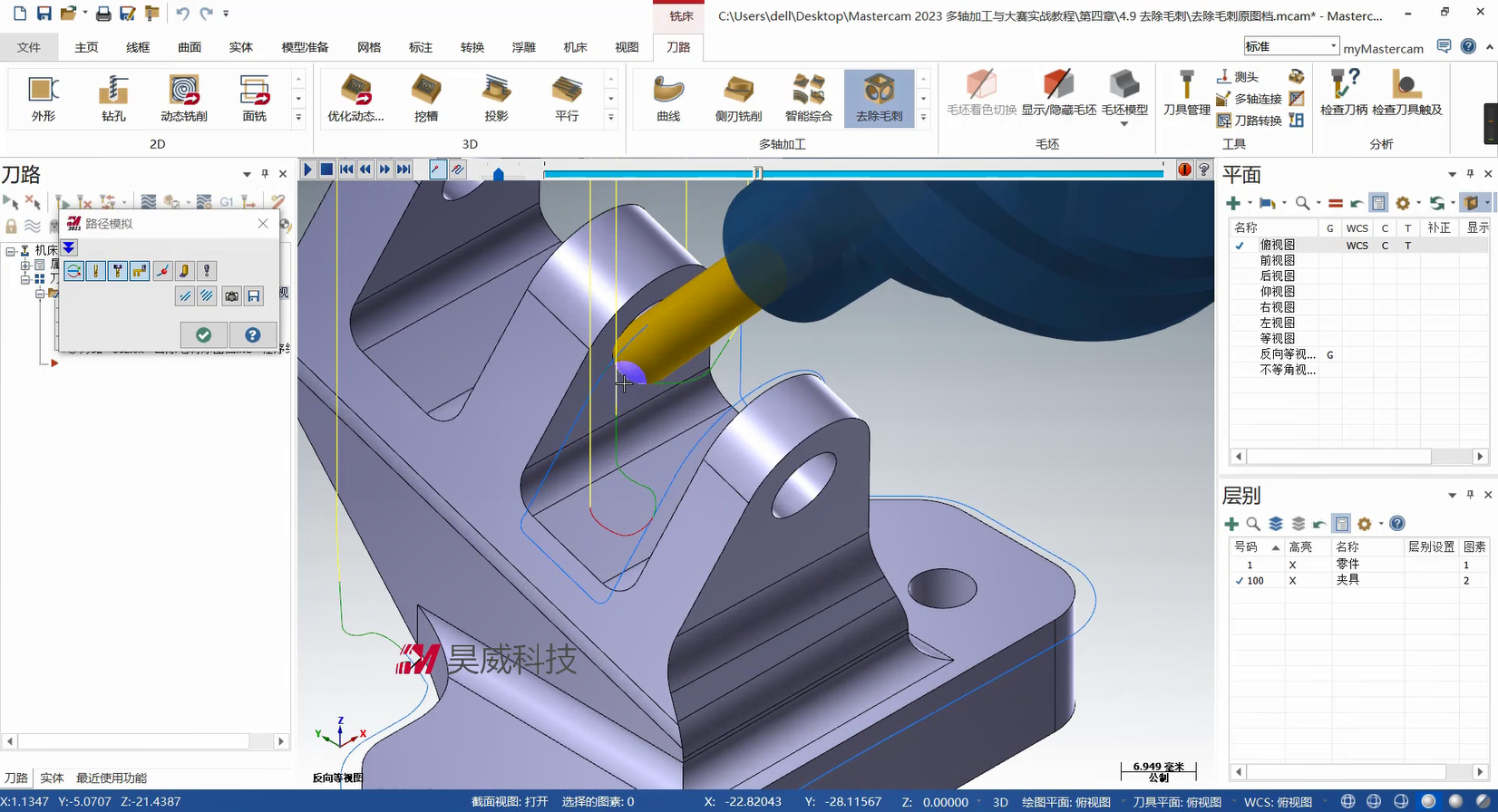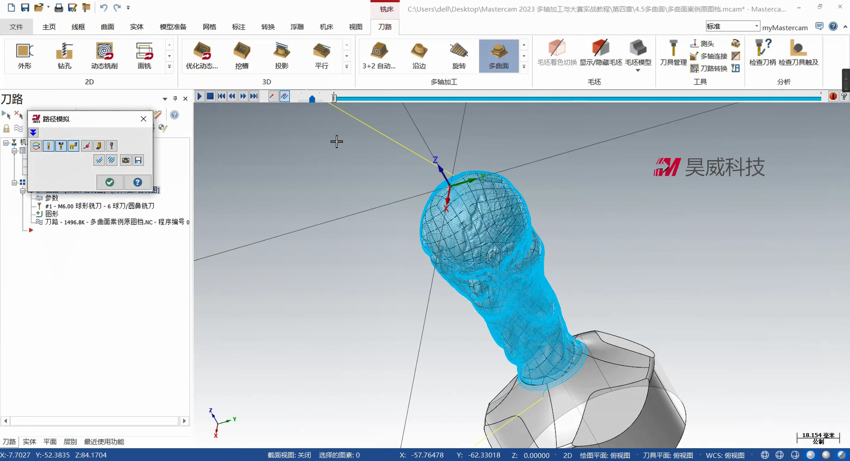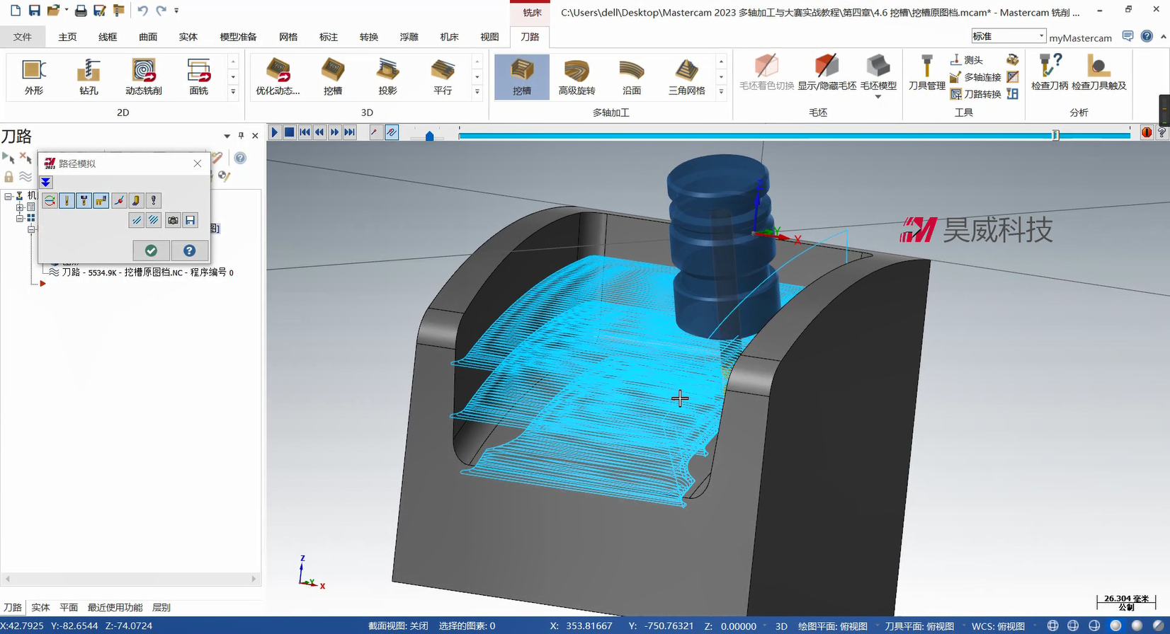 本章构建多轴联动编程的策略体系,从基础到高级功能层层递进。基础部分详解曲线策略、侧刃铣削的参数设定与刀路优化,涵盖切入切出设置、分层加工等拓展应用,提升常规零件加工效率。高级策略部分重点讲解智能综合策略的驱动模式与碰撞控制、沿面策略及多曲面策略的刀轴投影补正,满足曲面刻字、去毛刺等特殊需求。此外,课程针对挖槽加工细分粗切、侧壁与底面精加工策略,结合进给速率控制与刀轴调整提升加工质量;旋转策略部分则覆盖切削方式设定、安全区域设置等核心技术。针对叶轮加工场景,专门解析叶片专家策略中轮毂、圆角及叶片部位的精修技术,并为大家讲解通道专家策略的使用方法,适配航空航天等领域复杂零件加工。