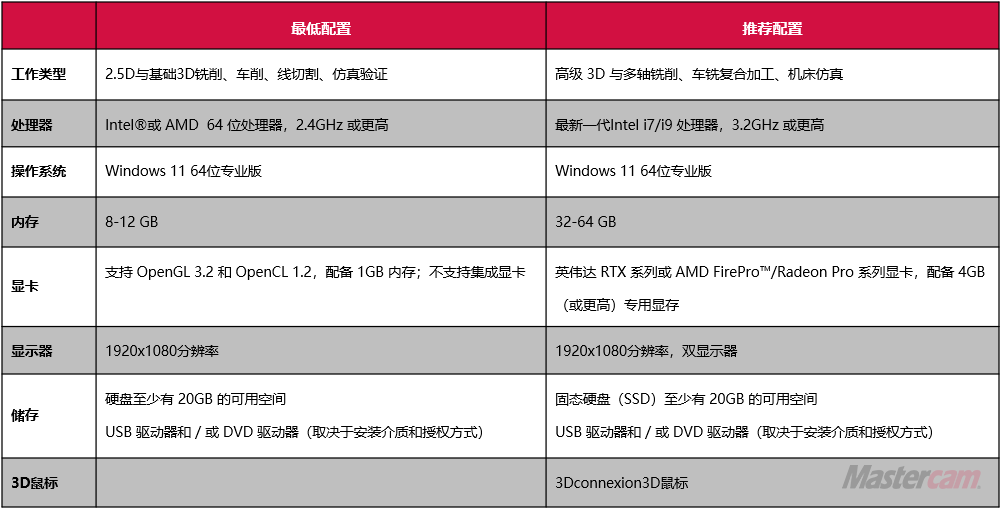 有关 Mastercam 的最低和推荐系统配置,请参阅下表。建议连接到 Internet 和电子邮件以进行安装、支持和更新。